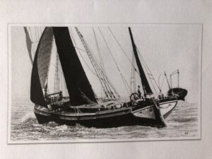 Barry Pearce studied art in his youth but went on to becoming a shipwright and barge master during the 1960s. He has been a life-long barge ‘buff’ – historian – and chronicaller of the Thames Sailing Barge. I first met Barry in 1964 at Cooks Yard in Maldon when the May Flower, my childhood home, went on the blocks to have her port bow rebuilt.
