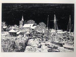 Clearly this is a winter depiction of Maldon and the ‘bargemen’s church’ up on its hill above the Hythe.