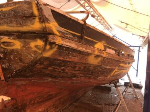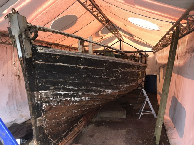 Between the two 20th century world wars she is said to have been a yacht. During the 1950s she was acquired by Peter Brooks her undertook a structural rebuild. That was seventy years ago and now she has been hauled out for some much needed renovation…