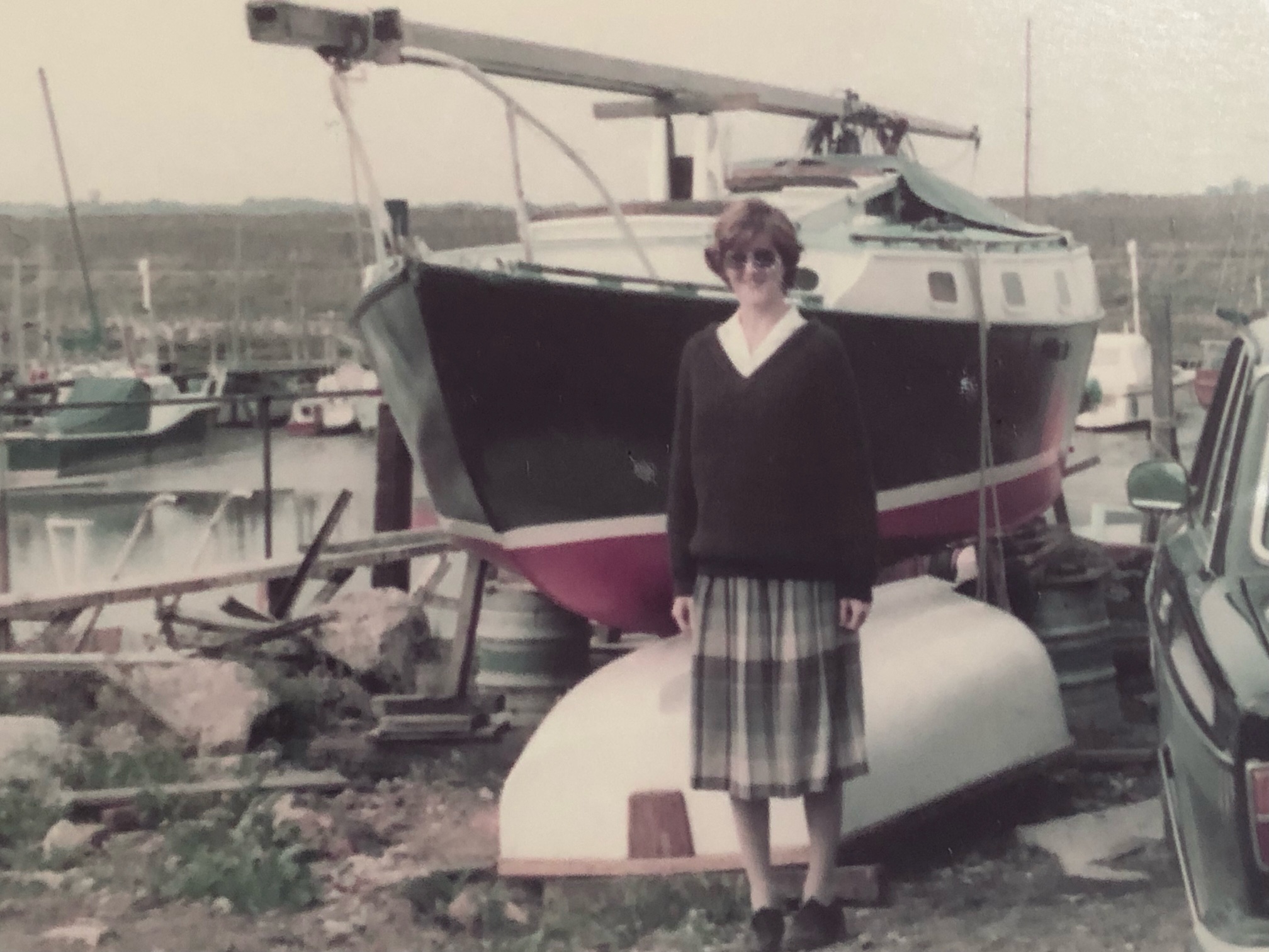 Below is a picture of Blue Tail out of the water back in 1982 (with Christobel posing in front…). The boats are virtually identical with differing details such as the deck edge rails.