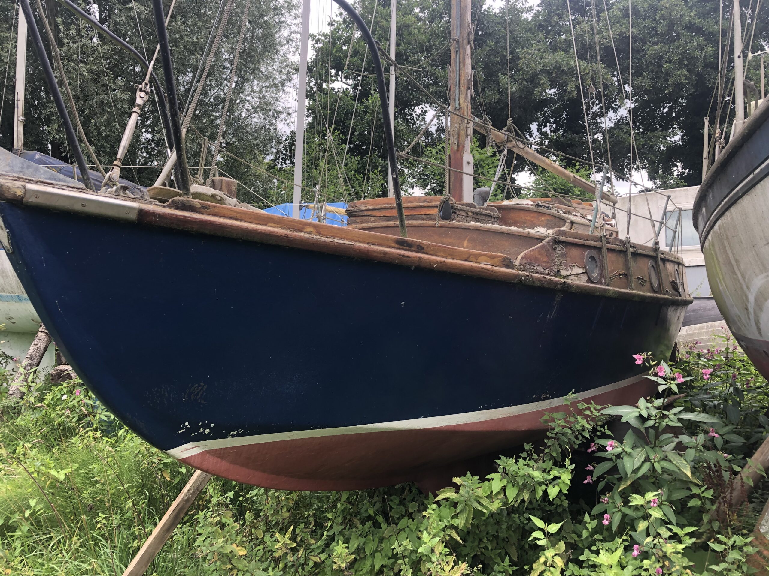The fence petered out and in we went … yes, the poor old thing was a Peoples Boat. I knew that there were some built with deeper draft whilst the one we had was fitted with a centre plate. She was painted in the same blue that we had too. Our upperworks were white painted though.