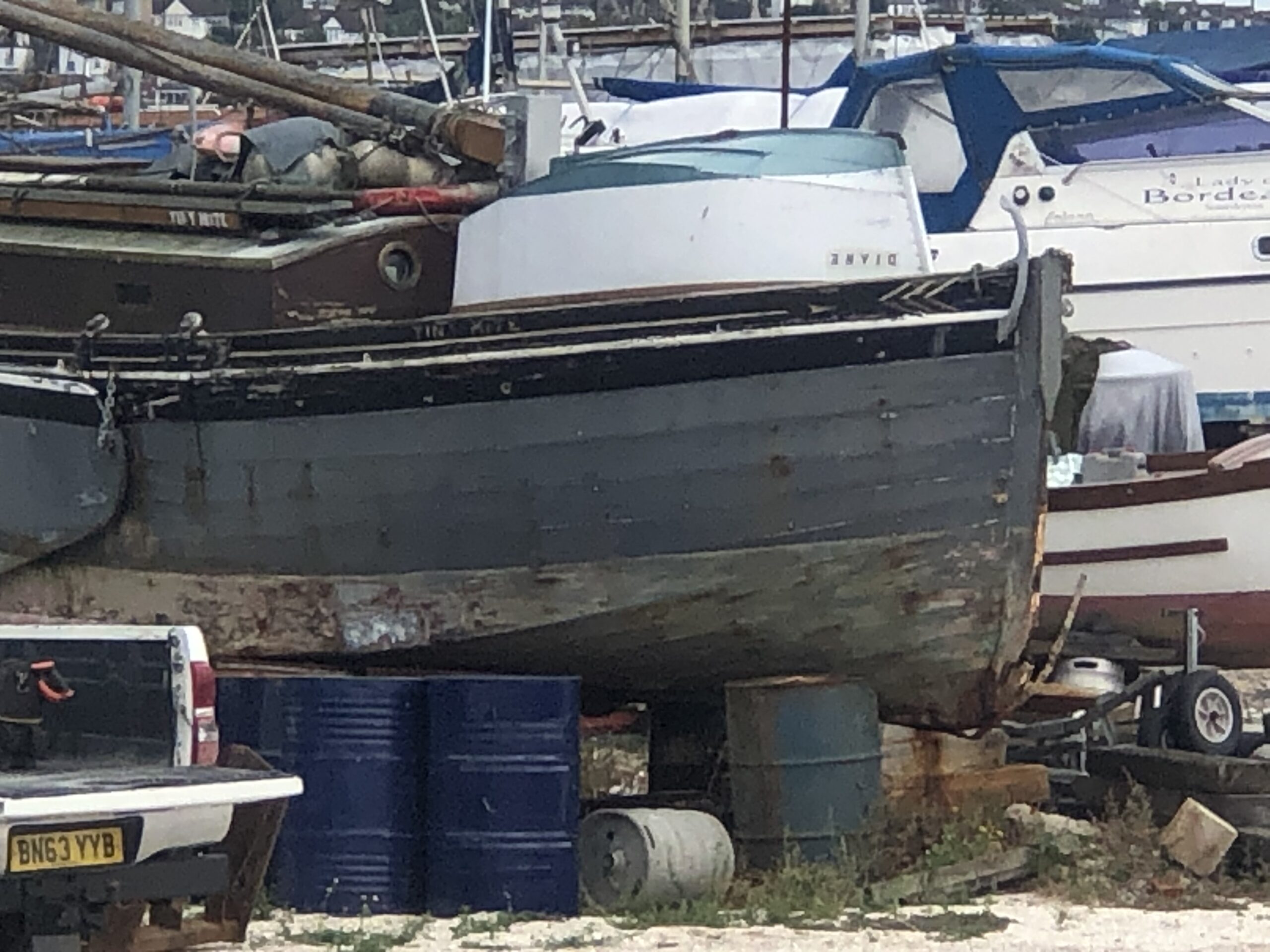 The barge-yacht Tiny Mite had been put on the market back in 2020 due to the then owner’s age related health issues. The old girl was out of the water a ‘jolly long time’ during a very long refit when she finally went back in. During 2021 Tiny Mite was lifted ashore by the Leigh Motor Boat club’s yard team as the poor thing was taking in water.
