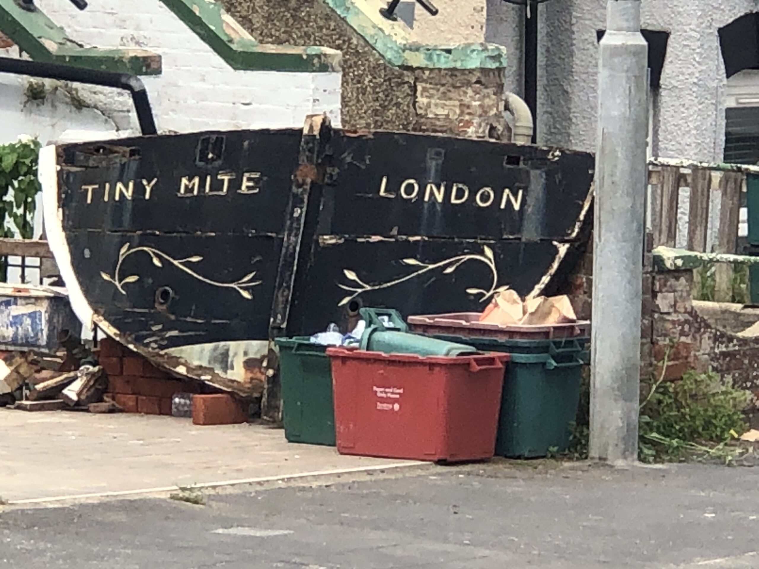 On the way back, I spotted the familiar sight of the Tiny Mite’s sawn off transom in the front garden of a property on the edge of Harwich town itself.